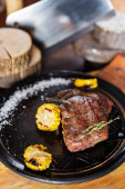 Sfermentowany stek. Stek z rozmarynem na czarnym talerzu podawany z grillowaną kukurydzą na tle zieleni, przypraw i świeżych warzyw, na blasze miedzianej. Zamknij się. seria zdjęć