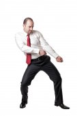 szczęśliwy biznesmen w garnitur, grając na gitarze powietrza na białym tle