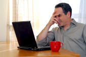 biznesmen w swoim biurku na białym tle
