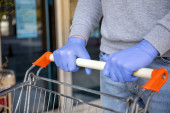 Kobieta w sklepie z materiałami budowlanymi wybiera duży topór. Ręce do góry.