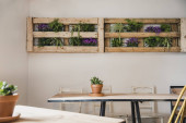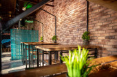 wiele zielonych kwiatów na tle ściany z białej cegły we wnętrzu.