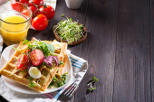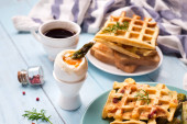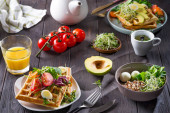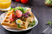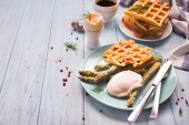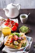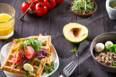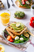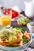 Świeże pieczone belgijskie gofry ze szpinakiem, jajkami, pomidorami i awokado na niebieskim talerzu. Słone gofry. Zdrowe śniadanie.