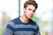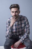 Atrakcyjny model męski z krótkimi włosami pozujący w studio na odosobnionym tle. Styl, trendy, koncepcja mody.