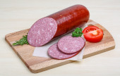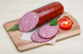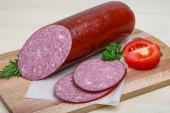 plasterki kiełbasy z warzyw na talerzu drewniane na białym tle