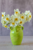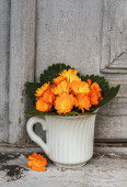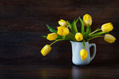 Mały żółty tulipan w zabytkowym kubku na rustykalnym stole