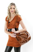 piękna kobieta z kurtki skórzane i torby pozowanie