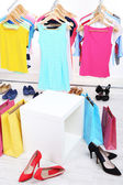 kobieta młody wybrać ubrania w pobliżu stojak z wieszakami