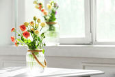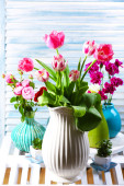bukiet kolorowych tulipanów na krześle, na tle wnętrz domu