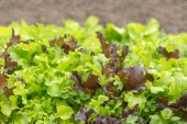 W ogrodzie, świeża zielona sałata rośnie w plastrze warzywnym