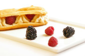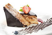 kawałek ciasta z orzechami pokryta czekolady oblodzenia z jagód