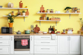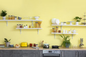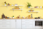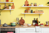 Zdjęcie "Przybory kuchenne i produkty na stole w nowoczesnej kuchni" może być wykorzystywane do celów osobistych i komercyjnych zgodnie z warunkami zakupionej licencji Royalty-free. Obraz jest dostępny do pobrania w jakości wysokiej rozdzielczości do 5760x3840.