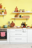 Przybory kuchenne i produkty na stole w nowoczesnej kuchni