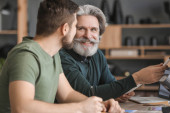 Zdjęcie "Dojrzały mężczyzna uśmiecha się do syna z filiżanką kawy w domu, baner " może być wykorzystywane do celów osobistych i komercyjnych zgodnie z warunkami zakupionej licencji Royalty-free. Obraz jest dostępny do pobrania w jakości wysokiej rozdzielczości do 5760x3840.
