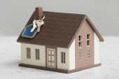 Koncepcja hipoteki i wynajmu mieszkań i nieruchomości. Kredyty hipoteczne. Makieta domu z metalowym breloczkiem na biurku