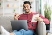Zdjęcie "Młodzieniec mający wideokonferencję z przyjaciółmi, korzystający z tabletu cyfrowego" może być wykorzystywane do celów osobistych i komercyjnych zgodnie z warunkami zakupionej licencji Royalty-free. Obraz jest dostępny do pobrania w jakości wysokiej rozdzielczości do 5760x3840.