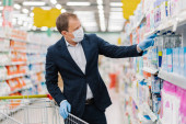 Zdjęcie "Millennial czarny facet w masce twarzy biorąc butelkę mleka z półki supermarketu, gestykulując kciuk w górę, zakupy w centrum handlowym" może być wykorzystywane do celów osobistych i komercyjnych zgodnie z warunkami zakupionej licencji Royalty-free. Obraz jest dostępny do pobrania w jakości wysokiej rozdzielczości do 5760x3840.