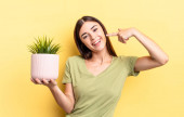 Zdjęcie "młoda blondynka czuje dumę, uśmiecha się pozytywnie z kciukami w górze i trzyma kaktusa" może być wykorzystywane do celów osobistych i komercyjnych zgodnie z warunkami zakupionej licencji Royalty-free. Obraz jest dostępny do pobrania w jakości wysokiej rozdzielczości do 5760x3840.