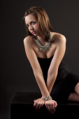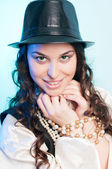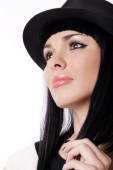 brunetka dziewczynka aby pozować do aparatu i dotykać jej kapelusz