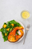 Pyszny obfity lunch, smażony kawałek pstrąga i mieszanka różnych rodzajów sałatki warzywnej, obiad ze zdrową czerwoną rybką