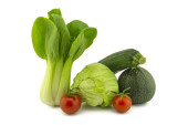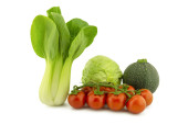 Zielona okrągła i tradycyjna cukinia lub cukinia, pomidor wiśniowy i świeża kapusta pak choi izolowane na białym tle