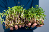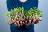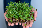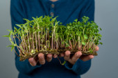 Trzymaj mikrozielony w rękach. Uprawa nasion słonecznika. Sprouted kiełki. Organiczne wegańskie jedzenie. Przydatne witaminy. Rośnie w domu. Kupa liści słonecznych. Wyhoduj mikrozielony. Mata pościelowa.