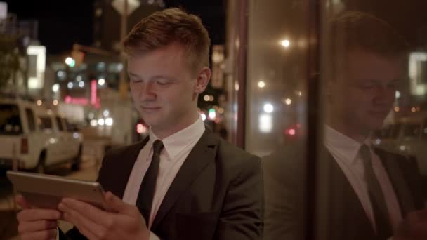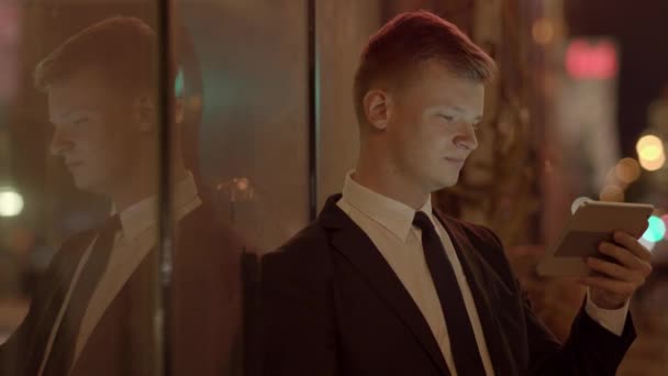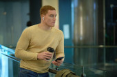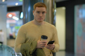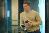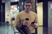 Młody człowiek używa smartfona i słucha muzyki w słuchawkach bluetooth. samotny mężczyzna w jesiennej kurtce pije kawę.