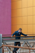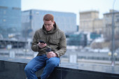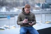 Zdjęcie "Młody człowiek używa smartfona i słucha muzyki w słuchawkach bluetooth. samotny mężczyzna w jesiennej kurtce pije kawę." może być wykorzystywane do celów osobistych i komercyjnych zgodnie z warunkami zakupionej licencji Royalty-free. Obraz jest dostępny do pobrania w jakości wysokiej rozdzielczości do 5760x3840.