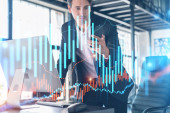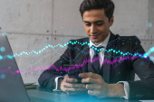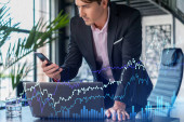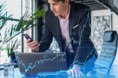 Przystojny biznesmen w garniturze w miejscu pracy pracujący z laptopem w celu optymalizacji strategii handlowej w korporacyjnym funduszu finansowym. Forex wykres hologram na tle biurowym
