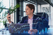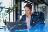 Zdjęcie "Przystojny biznesmen w garniturze w miejscu pracy pracujący z laptopem w celu optymalizacji strategii handlowej w korporacyjnym funduszu finansowym. Forex wykres hologram na tle biurowym" może być wykorzystywane do celów osobistych i komercyjnych zgodnie z warunkami zakupionej licencji Royalty-free. Obraz jest dostępny do pobrania w jakości wysokiej rozdzielczości do 5760x3840.