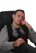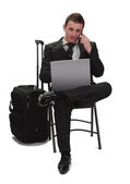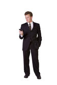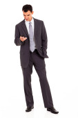obraz młodego biznesmena spaceru i sprawdzenie jego telefon komórkowy, na białym tle biały.