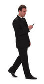 obraz młodego biznesmena spaceru i za pomocą telefonu komórkowego, na białym tle biały.