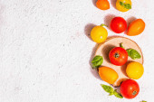Żółto-pomarańczowe pomidory w ceramicznej misce. Świeże dojrzałe warzywa, ekologiczny produkt rolny. Modne twarde światło, ciemny cień, drewniany stojak, marmurowe tło kamienia, przestrzeń do kopiowania