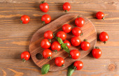 Czerwone pomidory wiśniowe na drewnianej podstawce. Świeże słodkie warzywa, ekologiczny produkt rolny. Nowoczesne twarde światło, ciemny cień, deska do krojenia, marmurowe tło kamienia, przestrzeń do kopiowania