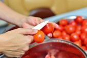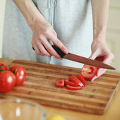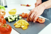 częściowy widok człowieka cięcia świeżych warzyw w kuchni, baner