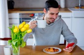 częściowy widok uśmiechniętego mężczyzny trzymającego smartfon i zieloną herbatę w pobliżu naleśników w kuchni