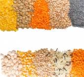 Różne surowe nasiona warzyw na białym tle, widok z góry
