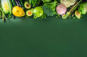 Zdrowa dieta Wiosna tle żywności. Asortyment świeżych ekologicznych warzyw zielonych - brokuły, kalafior, cukinia, ogórki, szparagi, szpinak, awokado, kapusta na ciemnozielonym tle