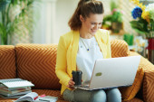 Zdjęcie "Zielony Dom. szczęśliwa gospodyni domowa w średnim wieku z długimi falowanymi włosami z filiżanką kawy i tabletem PC w beżowych spodniach i bluzce w nowoczesnym domu w słoneczny dzień." może być wykorzystywane do celów osobistych i komercyjnych zgodnie z warunkami zakupionej licencji Royalty-free. Obraz jest dostępny do pobrania w jakości wysokiej rozdzielczości do 5760x3840.