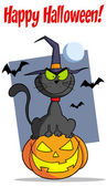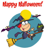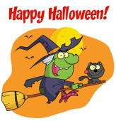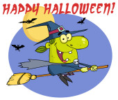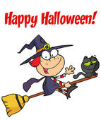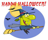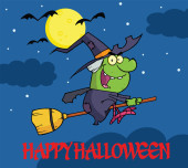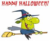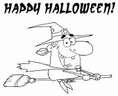 Kolorowanki Strona zarys latająca wiedźma na jej miotły z happy halloween tekst