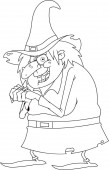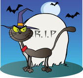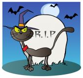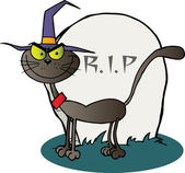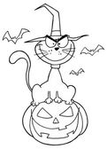 Kolorowanki Strona kontur kot sobie kapelusz czarownicy i siedzi na dyni przez nagrobek