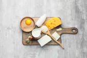 Deska ze smacznym serem, miodem i oliwkami na jasnym tle