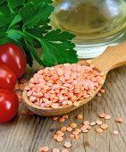 soczewica czerwona i zielona w drewniane łyżki na pokładzie