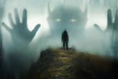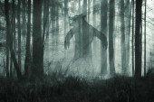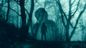 A dark scary concept. Of a man watching a mysterious bigfoot figure, walking through a forest. Silhouetted against trees. On a foggy winters day. With a grunge, textured edit.
