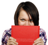 młoda dziewczyna pokazuje pusty pokładzie szary w studio