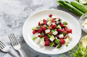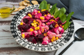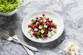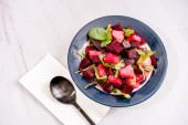Beet, pineapple and chicory salad with olive oil and basil on a plate on a rustic table in still life style. Fresh vegetables concept.