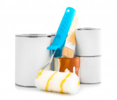 Puszki farb i narzędzi na białym tle