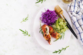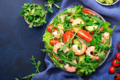 Zdjęcie "Sałatka krewetek. Sałatka z krewetek, rukola, plasterek awokado, zbliżenie. Zdrowa koncepcja. Widok z góry, sztandar, płaski układ" może być wykorzystywane do celów osobistych i komercyjnych zgodnie z warunkami zakupionej licencji Royalty-free. Obraz jest dostępny do pobrania w jakości wysokiej rozdzielczości do 5760x3840.