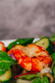 Sałatka krewetek. Sałatka z krewetek, rukola, plasterek awokado, zbliżenie. Zdrowa koncepcja. Widok z góry, sztandar, płaski układ