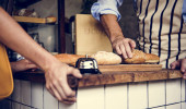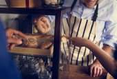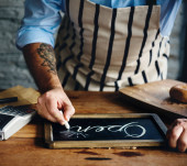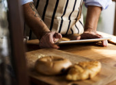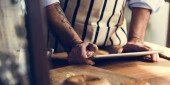 Wytatuowany mężczyzna korzystający z tabletu cyfrowego w piekarni