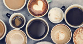 Kubki gorącej kawy na drewnianym stole, płaskie leżaki